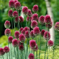 Аллиум Сфероцефалон – декоративно-цветущий лук с небольшими плотными соцветиями в виде фиолетовых шариков, которые напоминают клевер. Аромат очень нежный и приятный. Высота растения – около 70 см, цветет в июле. Растение шикарно смотрится в групповой посадке низкорослых луков. Широко используется в рабатках, альпийских горках, комбинированных цветниках.